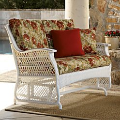 Stylish flat-weave resin wicker gliders are ideal for patio, deck, 3-season room or porch. Patio gliders offer generously-sized seats and gracefully curved arms. Double porch glider comfortably seats 3 people. Get ready to relax and enjoy the smooth, gentle motion of our Saybrooke Resin Wicker Gliders. The classic porch glider, beautifully updated! Designed with strong steel frames meticulously wrapped in hand-woven resin wicker, these patio gliders are handsomely finished with braid trim for fresh appeal. The resin wicker gliders feature a smooth flat weave that's more comfortable and won't snag fabrics. With their effortless back-and-forward motion, these porch gliders are wonderfully relaxing. Requiring little maintenance, these charming patio gliders are a great investment you'll enjoy for many years. Cushion requirements (sold separately). Double Glider: (2) Chair Cushion Set Single Glider: (1) Chair Cushion Set When ordering Saybrooke Resin Wicker Gliders, please specify finish: white or mocha/java, as available below. Benefits of Saybrooke Resin Wicker Gliders: Read more...